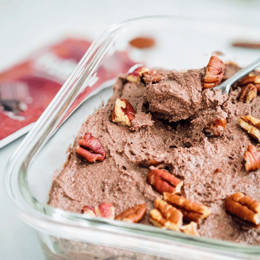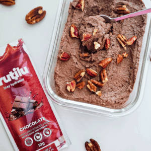 The secret? A blend of dark chocolate, silky tofu, a touch of almond milk, and our Frutilu Chocolate instant drink, which adds flavor and sweetness without any added sugar.